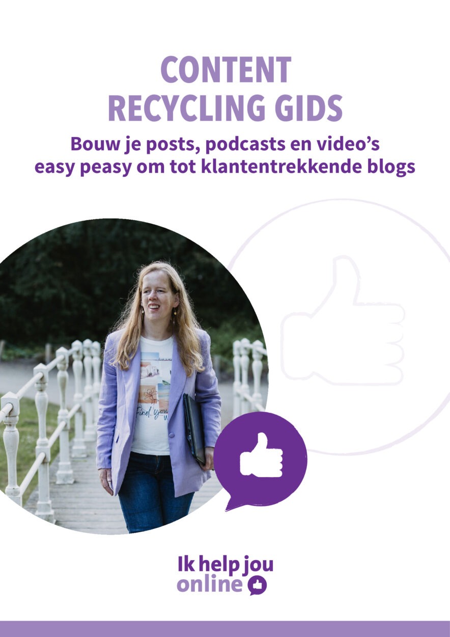 Schaf dan deze praktische Content Recycling Gids aan om jouw social media content (en je eventuele podcasts en YouTube-video’s) easy peasy om te bouwen tot klantentrekkende blogs die goed gevonden worden in Google en andere zoekmachines. Je kunt direct met deze 14 pagina’s tellende Content Recycling Gids aan de slag.