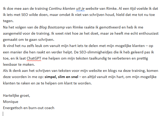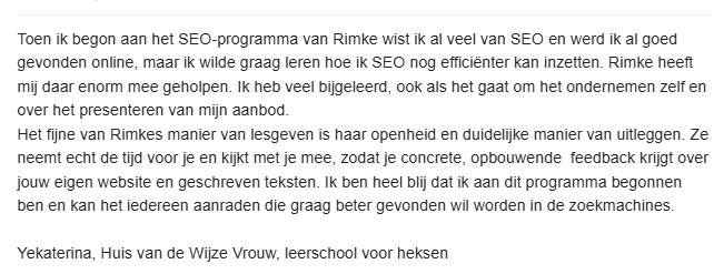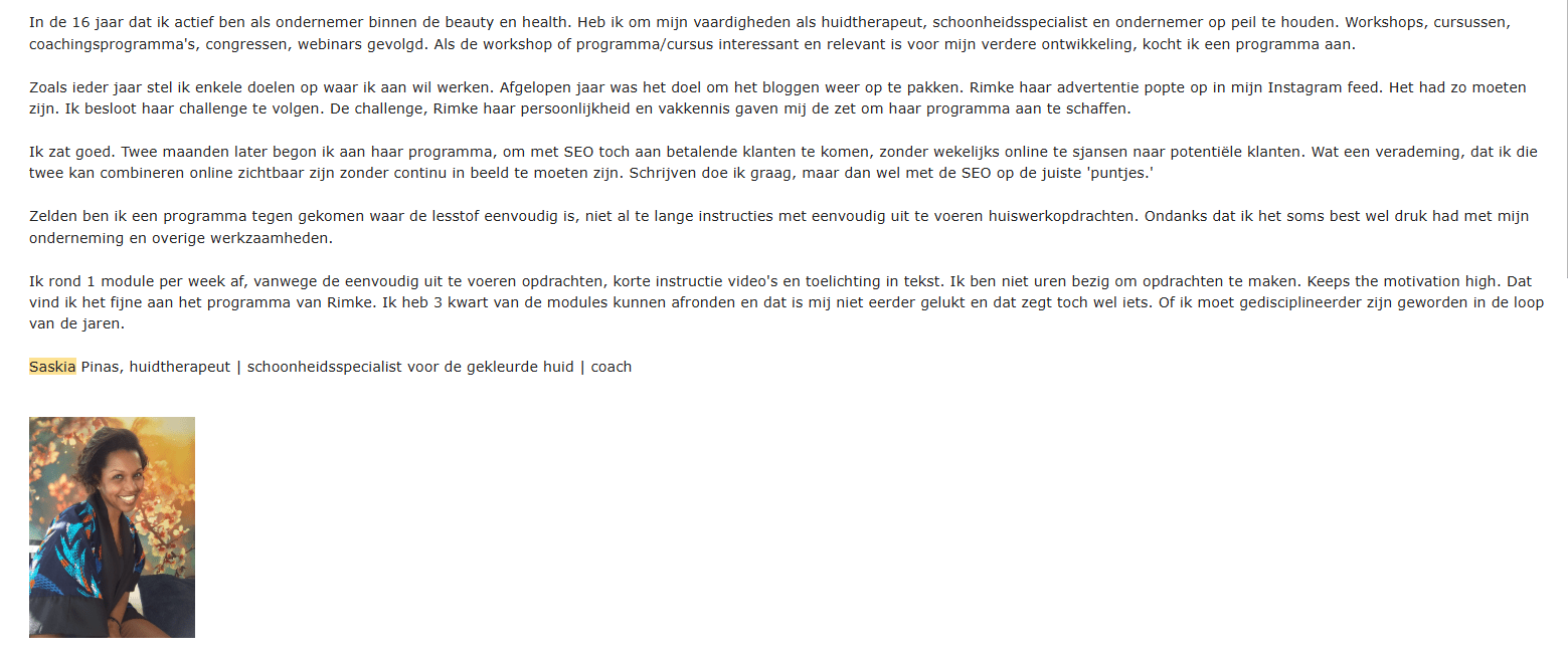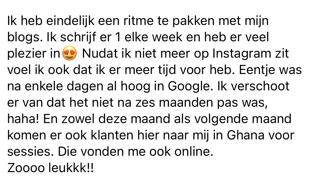 Dat je je niet langer gejaagd en onrustig voelt omdat je minstens 3 keer per week iets waardevols moet posten op social media of het gevoel hebt dat je vastzit in de ratrace van Instagram of LinkedIn. Dat SEO er voor zorgt dat nieuwe klanten vanzelf naar jou toe komen, ook op de momenten dat jij niet hard aan het werk bent.