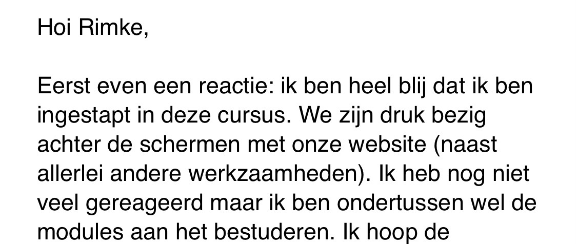 Absoluut. Je volgt Continu klanten uit je website in een groep van maximaal 18 ondernemers. Ik houd de groep bewust zo klein zodat ik jou en alle anderen binnen deze groep echt persoonlijk kan begeleiden. Tijdens de Vliegende Start Calls heeft iedereen de ruimte om vragen te stellen. En om de calls heen kun je ook per mail en in de besloten Whatsapp-groep bij mij terecht met al je vragen.