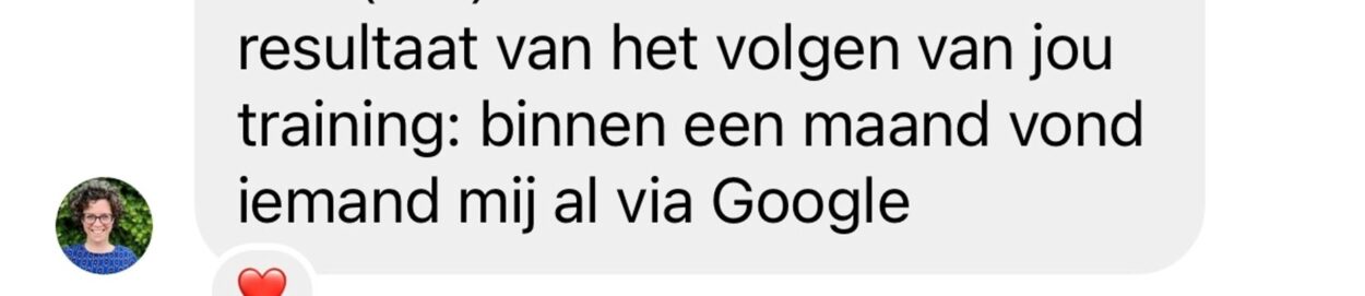 En stel je voor wat er gebeurt als je een andere route kiest. Als je kiest voor mijn programma, kies je ook voor serieus aan de slag gaan met je vindbaarheid én voor slimmer werken in plaats van harder. Wat anders een jaar zou duren, ga je nu in 4 à 5 maanden realiseren. Je wordt veel sneller vindbaar voor nieuwe leads en klanten, houdt tijd over omdat je niet meer telkens zichtbaar hoeft te zijn op social media en ervaart eindelijk wél de vrijheid én groei waar je al zo lang naar verlangt.
